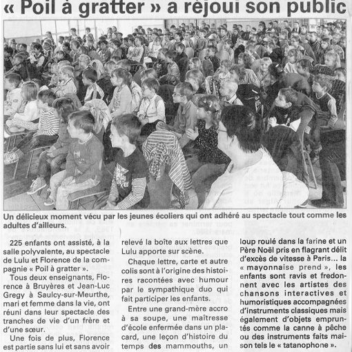 Publié 15 mai 2025 La compagnie Poil à Gratter enchante les petits de la maternelle La compagnie Poil à Gratter enchante les petits de la maternelle